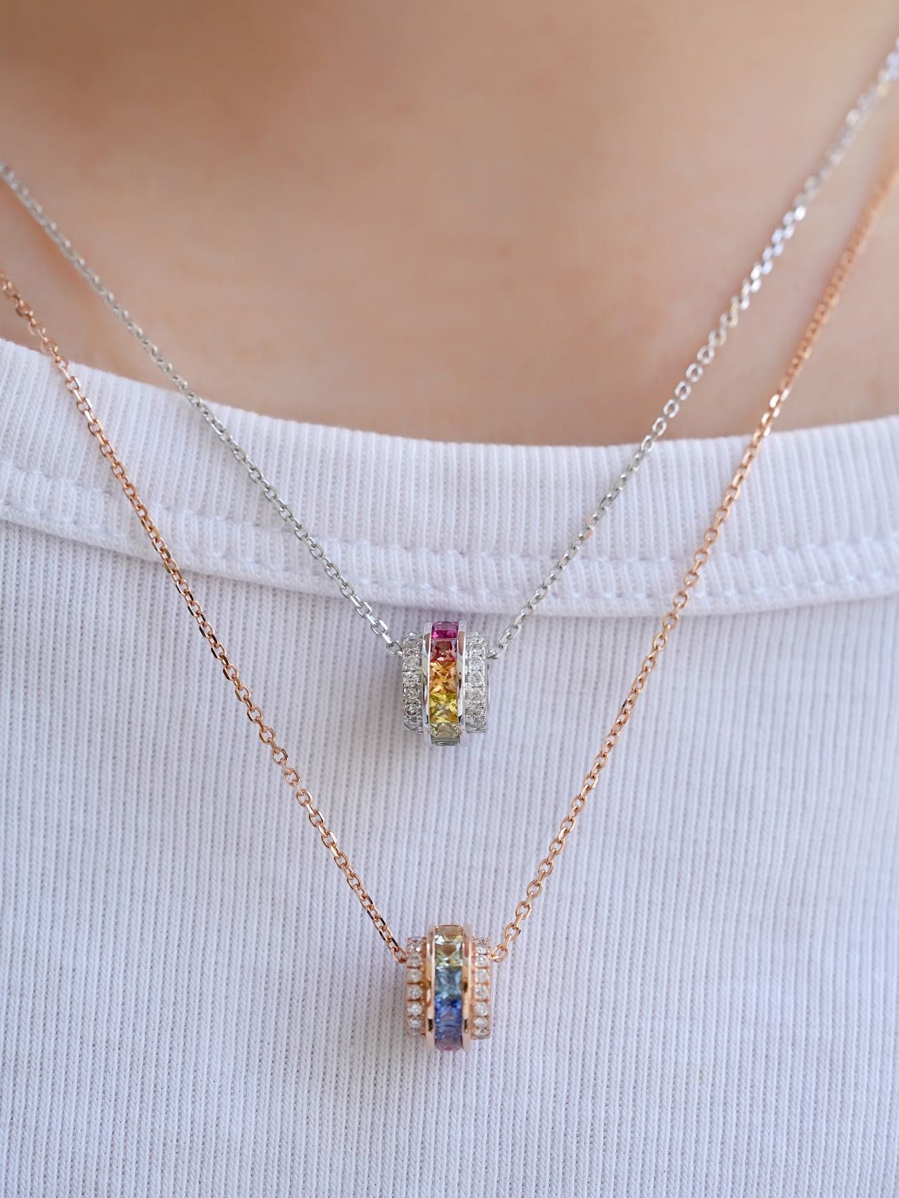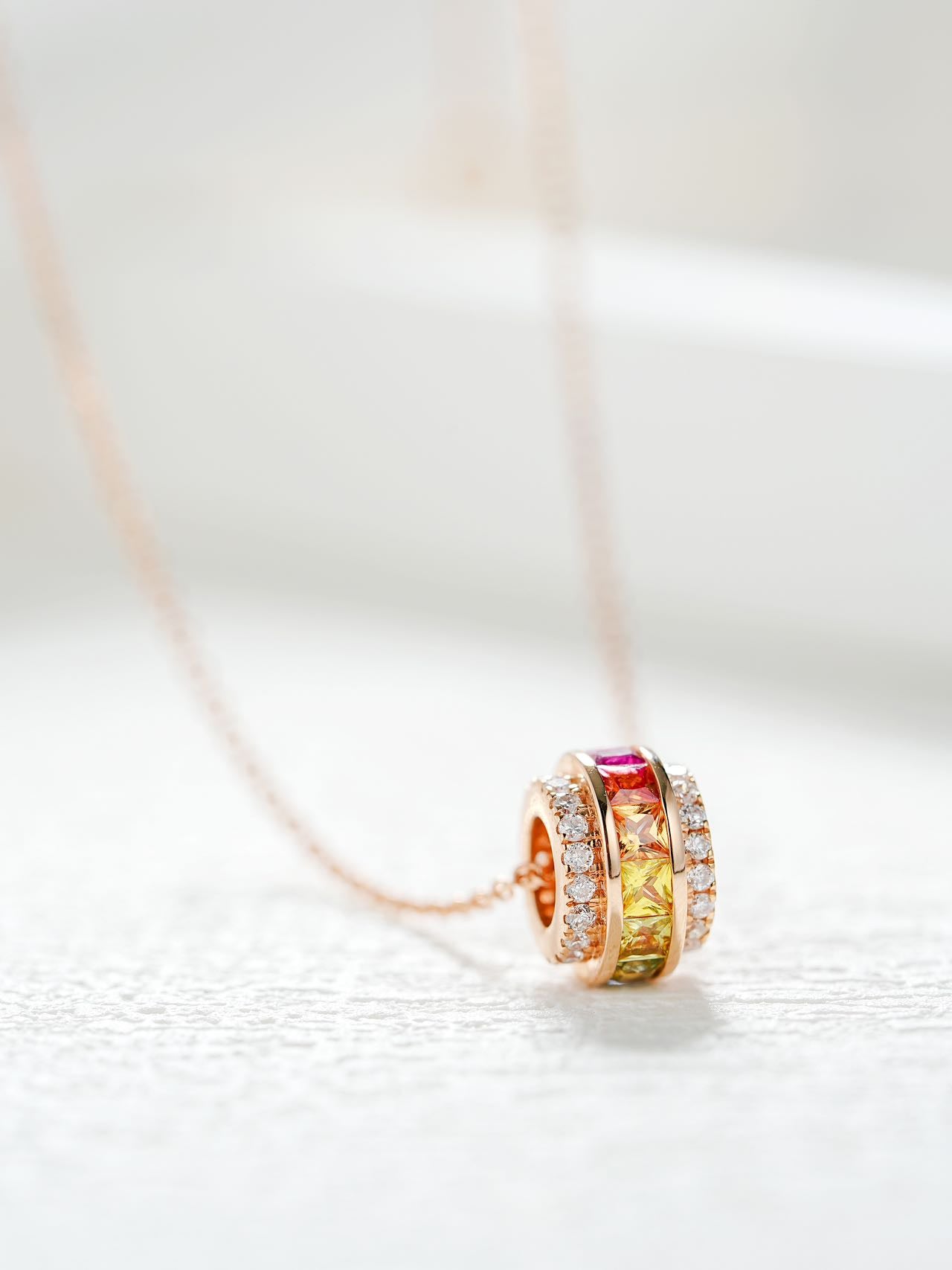 This elegant 18k gold necklace features a custom sapphire wheel design, adding a touch of sophistication to any outfit. Handcrafted with quality materials, this necklace is both durable and stylish. Perfect for both formal and casual occasions, this necklace is sure to impress.